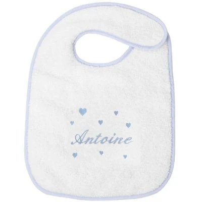 – Bavoir en éponge blanche avec attache velcro bordé d’un biais bleu.
