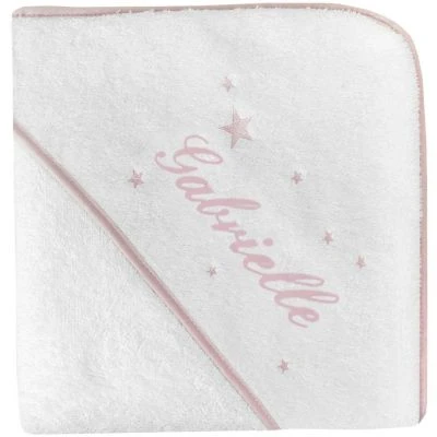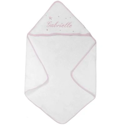 – Cape de bain en éponge blanche avec un biais rose.