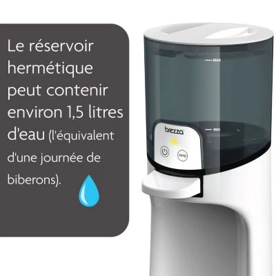 – Possède un réservoir hermétique qui peut contenir jusqu’à 1,5L d’eau, équivalent à une journée complète de biberons.