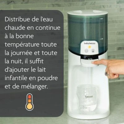 – Ajoutez le lait en poudre, mélangez et le biberon est prêt ! Laisser brancher et allumer la machine pour qu’elle chauffe en continue l’eau.