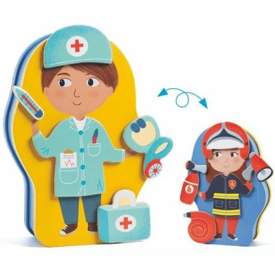 – 20 éléments en bois magnétiques pour habiller les personnages avec la tenue adaptée pour différents métiers.