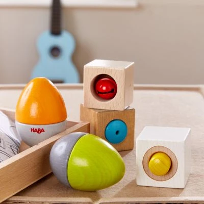 – 5 jouets musicaux en bois pour tout-petits : oeuf musical, cube sonore avec cliquetis, claquement, couinement ou grelot…