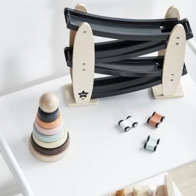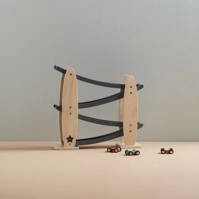 – Voiture en bois de bouleau avec essieu en aluminium.