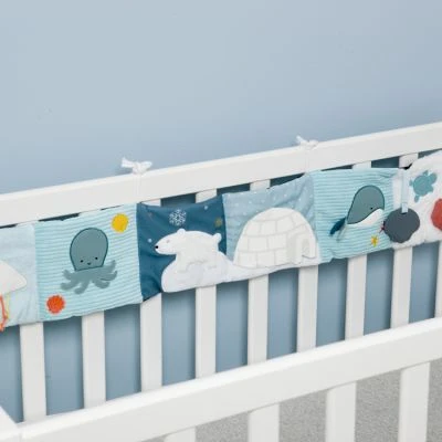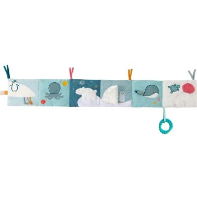 – Activités intégrées : 3 cordons, un ours couineur, un pingouin qui se cache, 2 anneaux de dentition, une pieuvre dont les tentacules sont mobiles.