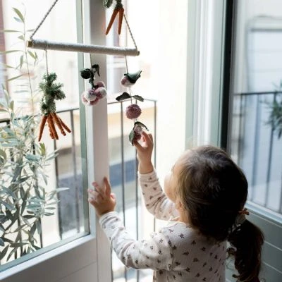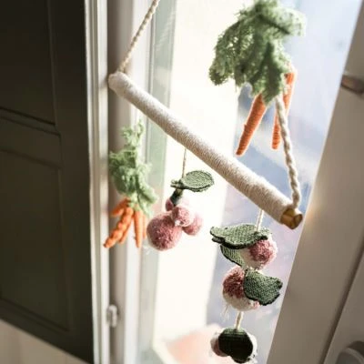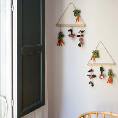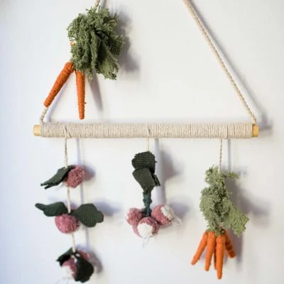 – Suspension murale décorative avec des carottes et des radis en coton faits à la main.