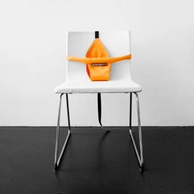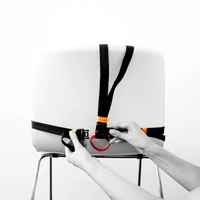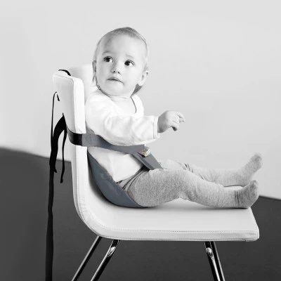 – Poser le mini siège sur la chaise, installer le bébé, fermer le clip puis tirer sur les sangles pour ajuster la longueur.
