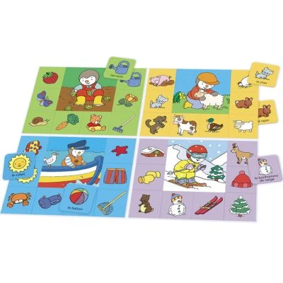 – 32 images à associer à 4 grandes planches pour découvrir T’choupi à la mer,à la montagne, à la ferme et au jardin.