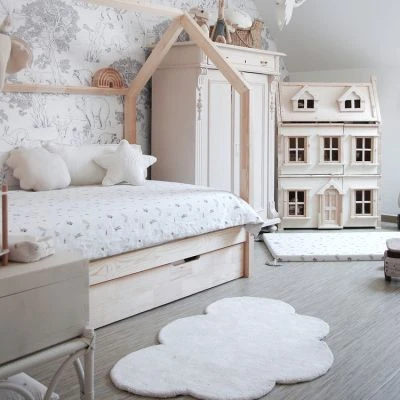 Le tapis coton nuage blanc by Sophie Cordier pour Lilipinso apporte une touche colorée au décor d’une chambre d’enfant.